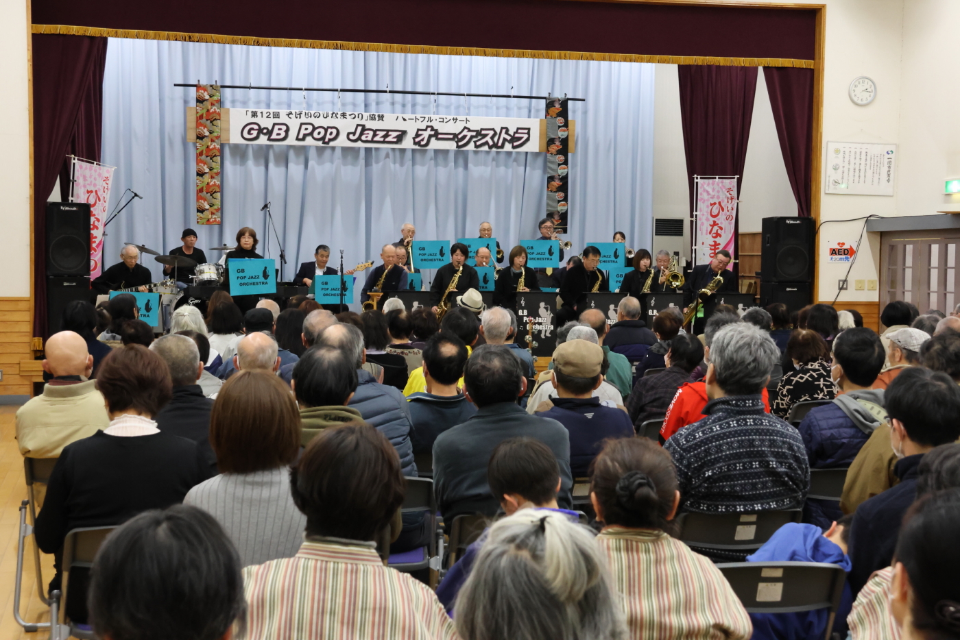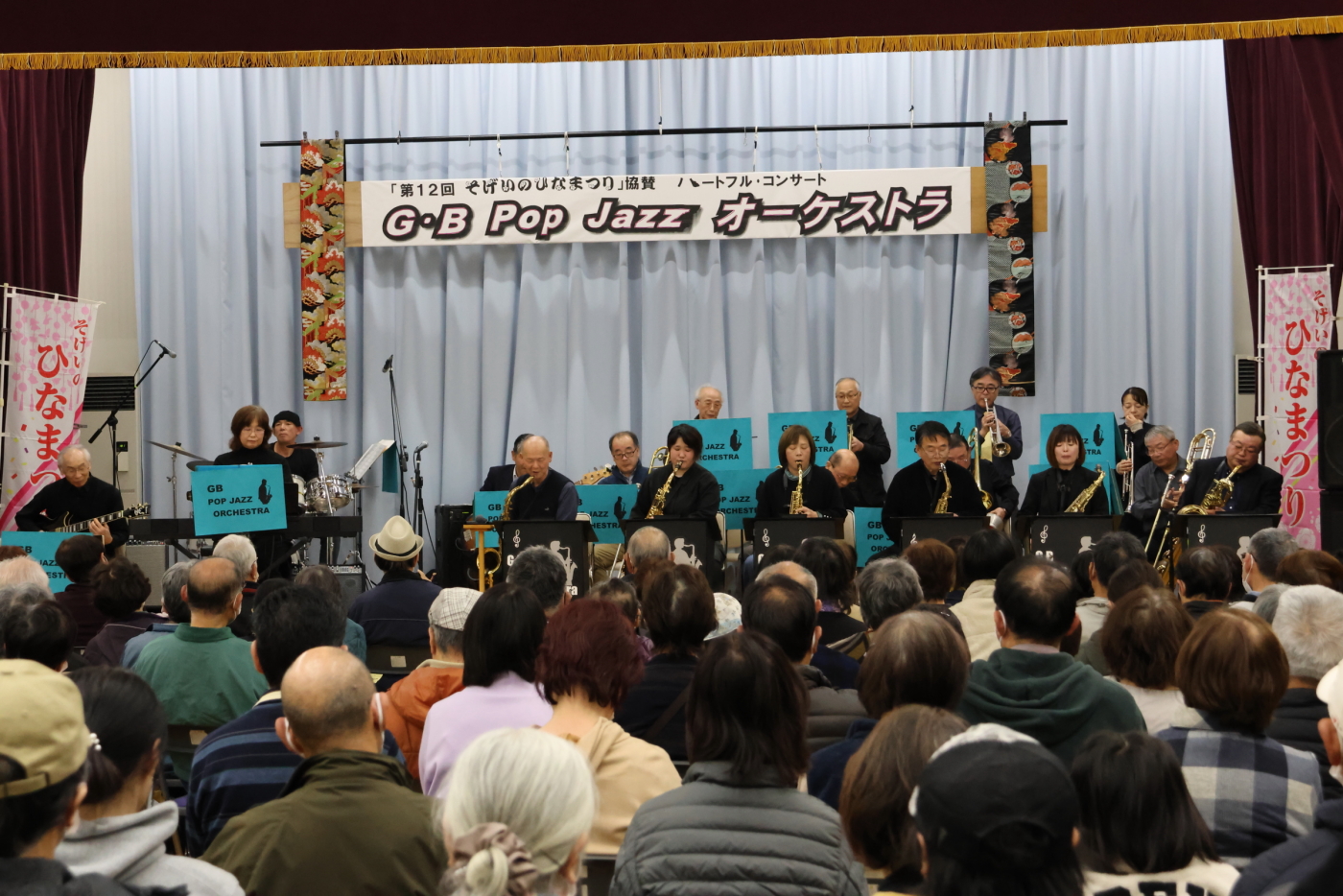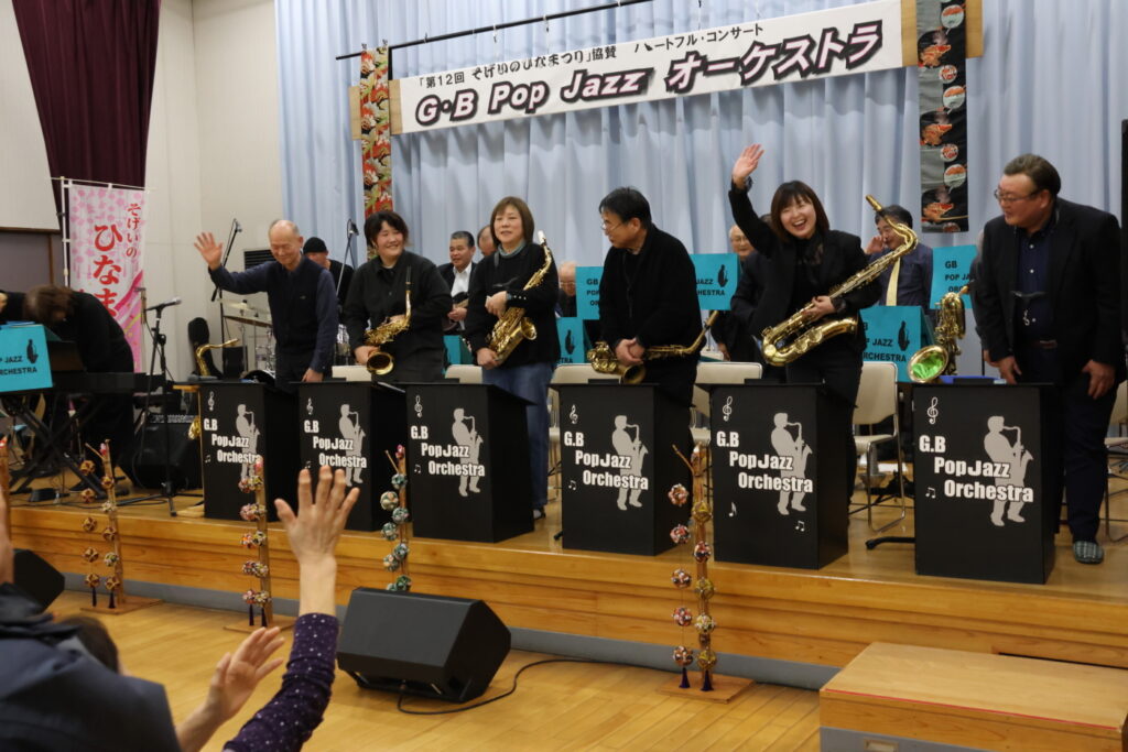 3月1日にひなまつりの協賛事業として開催した『ハートフル・コンサート』はG・B Pop Jazz オーケストラの皆さん18名による迫力ある演奏で会場を沸かせました。コンサートに訪れた約150名の皆さんは、ジャズや歌謡曲、映画音楽などの多彩な楽曲を堪能しました。