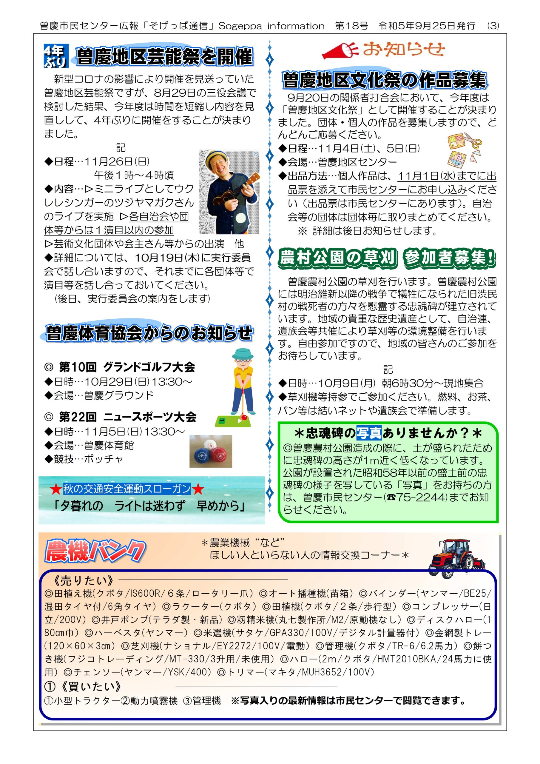 曽慶市民センター広報「そげっぱ通信9月号」を発行しましたのでアップします。